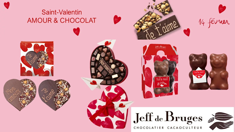 Quand la passion pour le chocolat rencontre l'amour, gourmandise et nouveauté sont au rendez-vous chez Jeff de Bruges. Faites le choix de personnaliser cette tendre journée en faisant inscrire gratuitement votre délicieux mot.